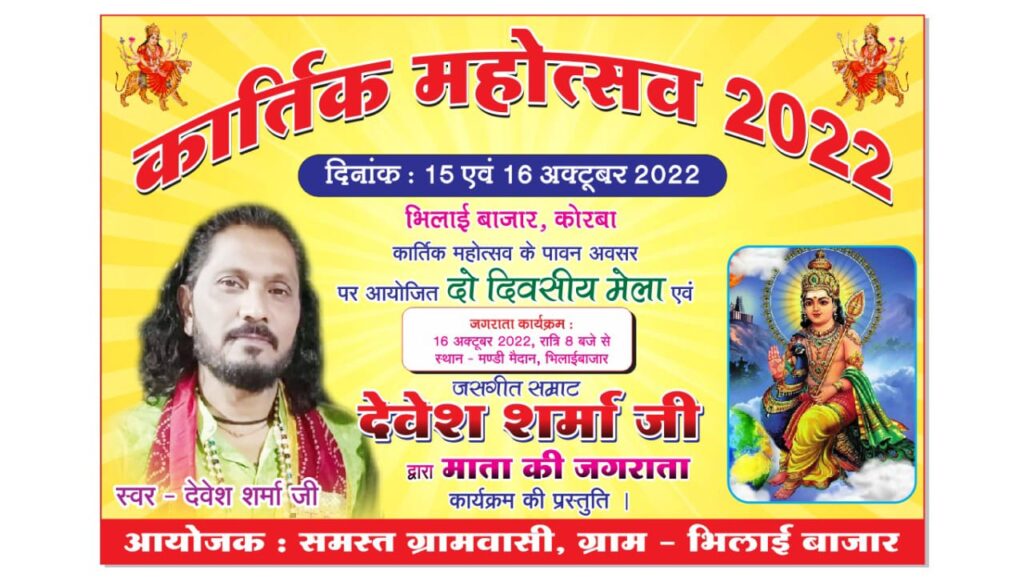 कोरबा जिला के ग्राम भिलाईबाजार में दो दिवसीय कार्तिक महोत्सव का आयोजन आगामी 15 अक्टूबर से किया जा रहा है। जिसकी तैयारियां ग्रामीणों द्वारा की जा रही है। दो दिन तक चलने वाले इस कार्यक्रम में बाहर से आने वाले कलाकारों द्वारा अनेको प्रकार के कार्यक्रम की प्रस्तुत की जाएगी। जिसमें जसगीत सम्राट देवेश शर्मा का कार्यक्रम प्रमुख रूप से शामिल है। जो 16 अक्टूबर 2022 को रात्रि 8 बजे से प्रारंभ होगा । यह बताना होगा कि नव दुर्गा उत्सव के साथ ही ग्रामीण अंचलों में इस समय जसगीत जागरण के कार्यक्रम आयोजित किये जाने का दौर चल रहा है। इसी कड़ी में भिलाईबाजार में ग्रामीणों द्वारा कार्यक्रम आयोजित किया जा रहा है। उक्त कार्यक्रमभिलाईबाजार मंडी मैंदान में 16अक्टूबर की रात्रि 8 बजे सेआयोजित किया जाएगा।