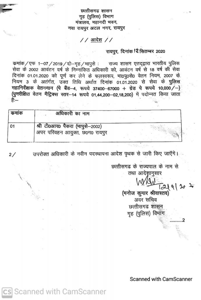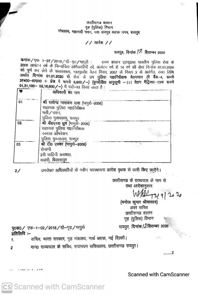 रायपुर12सितंबर(krb24news): छत्तीसगढ़ सरकार ने आखिरकार डीजी समेत आईपीएस अधिकारियों के बहुप्रतिक्षित डीपीसी पर मुहर लगा दिया। मुख्यमंत्री के दस्तखत के बाद गृह विभाग ने आदेश जारी कर दिया है। आदेशानुसार संजय पिल्ले, आरके विज और अशोक जुनेजा को प्रमोट कर डीजी बनाने का फैसला हुआ है। बताते हैं. उधर सेंट्रल डेपुटेशन में दिल्ली में पोस्टेड आईपीएस रवि सिनहा को सरकार ने प्रोफार्मा प्रमोशन दिया है। इनके अलावा सरकार ने प्रदीप गुप्ता को आईजी से एडीजी, टीसी पैकरा को डीआईजी से आईजी, आरएन दास, पीएस ध्रुव, टी एक्का डीआईजी प्रमोट कर दिया है। सलेक्शन ग्रेड में दीपक झा, जीतेद्र सिह मिणा, डीके गर्ग और बालाजी सोमावार शामिल हैं। अभिषेक शांडिल्य और रामगोपाल गर्ग को प्रतिनियुक्ति पर प्रोफार्मा पदोन्नति दी गई है।