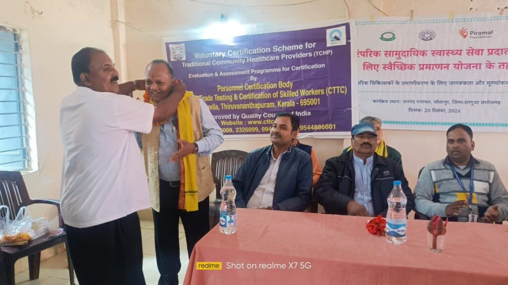 जसपुर जिला के आदिवासी बाहुल्य विकासखंडो वनोषधिया की पुरातन परंपरा और ज्ञान के मध्य से समुदाय के लोगो का त्वरित उपचार प्रदान कराने पंरपरागत वैधराजो को समाज की मुख्य धारा में शामिल करने के उद्देश्य से उनके ज्ञान को प्रामाणीकरण की 4 दिवसीय प्रक्रिया दिनाक 20/-23-24 से सरगुजा जशपुर 24 दिसंबर को सम्पान हुई स्थानी ग्राम पंचायत भावन लखनपुर जिला सरगुजा और ग्राम पंचायत भावन सीतापुर एवं वन मण्डल जिला जशपुर वन मंडल अधिकारी जशपुर के समछ सभागृह मे सम्पन्न हुए इस कार्यक्रम मेंQ C I दिल्ली तथा आयुष मंत्रालय के सहयोग से केंद्र शासन उसके •अधिकृत निकाय सेंटर फारा पिरामल फाउंडेशन एवं अन्य फाउंडेशन के सहयोग से जिला जसपुर एवं सुरजपुर जिले के वैधराजो प्रमाणित कर विकासखंड का कई प्रतिक्रिया के बाद 70 को •पररपारंगत वैधो स्वस्थ सेवा प्रदाताओं का दिनांक 21-23 – 24 को सुबह से रात तक एक एक घर जाकर उनके ज्ञान का भौतिक सत्यापन किया गया का विश्लेषन किया गाया प्रमाणिकरक दूसरे चरण के अंतर्गत दिनांक 24दिसंबर को सी टी टी सी क्यू.सी. आई. के दल के द्वारा जिला जशपुर मे वैध जन के घर घर जाकर भ्रमण किया गया