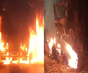 ट्रक जलकर खाक हो गया है. ट्रक ड्राइवर और कंडक्टर की सतर्कता से एक बड़ा हादसा टल गया.
