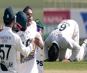 PAK vs WI, 2nd Test: पाकिस्तान और वेस्टइंडीज के बीच रावलपिंडी में 2 मैचों की टेस्ट सीरीज का दूसरा और आखिरी मैच खेला जा रहा है। दूसरे टेस्ट का आज पहला दिन है। टॉस जीतकर पहले बल्लेबाजी करते हुए वेस्टइंडीज की टीम बुरी तरह लड़खड़ा गई है। पाकिस्तानी स्पिनरों ने वेस्टइंडीज की बल्लेबाजी की कमर तोड़कर रख दी है। इस दौरान पाकिस्तान के 38 साल के स्पिनर नोमान अली ने गेंद से कहर बरपाते हुए हैट्रिक लेकर तहलका मचा दिया है। नोमान अली ने अपने तीसरे ही ओवर में पहली 3 गेंदों पर लगातार 3 बल्लेबाजों को आउट कर सनसनी मचा दी। इस तरह वह टेस्ट क्रिकेट के इतिहास में हैट्रिक लेने वाले पहले पाकिस्तानी स्पिनर बन गए।