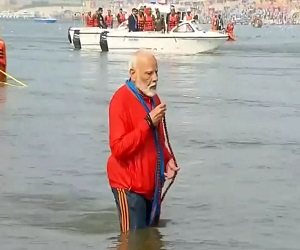 प्रयागराज: प्रधानमंत्री नरेंद्र मोदी प्रयागराज महाकुंभ पहुंच गए हैं। उन्होंने संगम में डुबकी लगाई। सीएम योगी उनके साथ हैं। पीएम करीब ढाई घंटे प्रयागराज में रहेंगे। मोदी मोटर बोट से योगी के साथ संगम पहुंचे। उन्होंने भगवा रंग के कपड़े पहन रखे थे। गले में रुद्राक्ष की माला थी। मंत्रोच्चारण के बीच पीएम मोदी ने अकेले ही संगम में डुबकी लगाई।