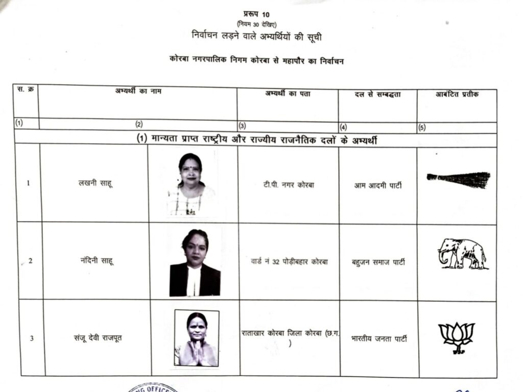 कोरबा : नगरीय निकाय चुनाव के लिए महापौर पद के प्रत्याशियों को चुनाव चिन्ह आवंटित कर दिए गए हैं। विभिन्न राष्ट्रीय और क्षेत्रीय दलों के उम्मीदवारों के साथ-साथ निर्दलीय प्रत्याशियों को भी चुनाव चिन्ह दिए गए हैं। इस बार महापौर की कुर्सी के लिए कुल 11 प्रत्याशी मैदान में हैं, जिनमें मालती किन्नर भी शामिल हैं।