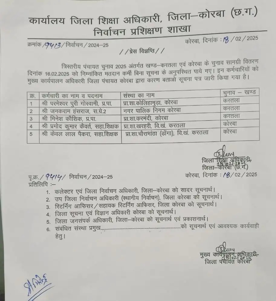 कोरबा : त्रिस्तरीय पंचायत चुनाव 2025 अंतर्गत खण्ड-करतला एवं कोरबा के चुनाव सामग्री वितरण दिनांक 16.02.2025 को निम्नांकित मतदान कर्मी बिना सूचना के अनुपस्थित पाये गए। इन कर्मचारियों को मुख्य कार्यपालन अधिकारी जिला पंचायत कोरबा द्वारा कारण बताओ सूचना पत्र जारी किया गया है।