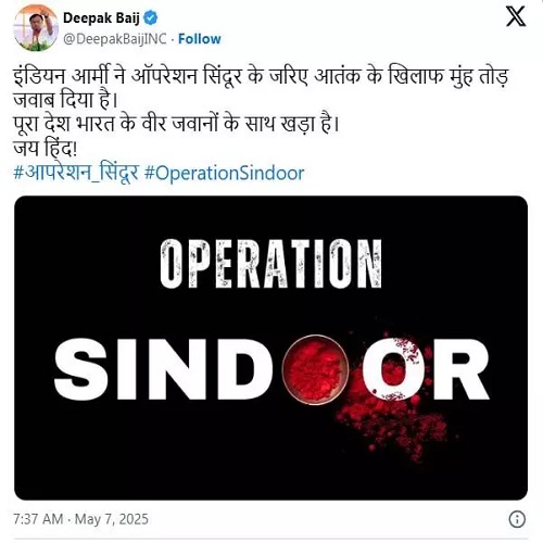 रायपुर : पाकिस्तान पर एयर स्ट्राइक के बाद कांग्रेस की प्रतिक्रिया सामने आई है। छत्तीसगढ़ कांग्रेस अध्यक्ष दीपक बैज ने कार्रवाई को लेकर सोशल मीडिया साइट x पर पोस्ट कर लिखा- इंडियन आर्मी ने ऑपरेशन सिंदूर के जरिए आतंक के खिलाफ मुंह तोड़ जवाब दिया है।