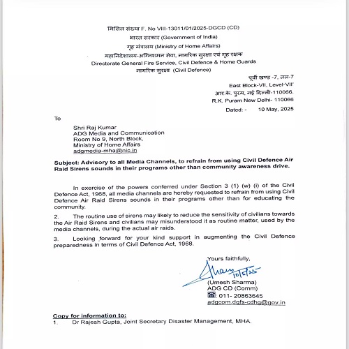 दिल्ली/रायपुर : TV न्यूज़ चैनल को भारत सरकार ने नसीहत दी है, अपने कार्यक्रमों में एयर डिफ़ेंस सायरन बजाना बंद करने कहा है.