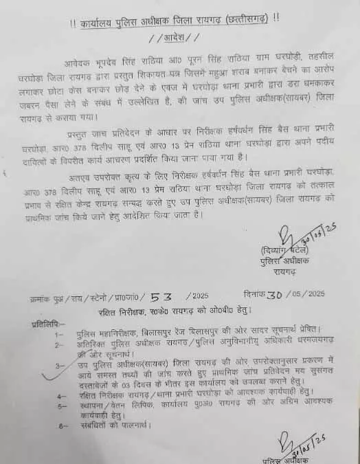 जानकारी के मुताबिक, ग्रामीण ने शिकायत की थी कि घरघोड़ा थाना प्रभारी हर्षवर्धन सिंह बैस और दो आरक्षकों ने उस पर महुआ शराब बनाकर बेचने का झूठा आरोप लगाया. इसके बाद उसे छोटा केस बनाकर छोड़ देने की बात कहते हुए पैसों की मांग की. पीड़ित का दावा है कि यह पूरी साजिश उगाही के इरादे से रची गई थी.