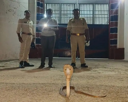 कोरबा : कोरबा जिला के जिला जेल में कल रात्रि एक नाग फन फैलाएं बैठा दिखाई दिया मानो जेल पहरी बन कर अपनी जिम्मेदारी निभा रहा, जिसके बाद जेलर सर एवं सिपाहियों के द्वारा वाइल्डलाइफ रेस्क्यु टीम प्रमुख जितेंद्र सारथी को सूचना दिया गया जिसके फौरन बाद सारथी ने अपने टीम के रेस्क्यु सदस्य राजू बर्मन को जिला जेल के लिए रवाया तब तक सांप पर नज़र रखने को कहा गया, थोड़ी देर बाद रेस्क्यु टीम पहुंची और फन फैलाएं बैठे नाग का रेस्क्यु किया गया, जिसके बाद भारतीय नाग के विषय में वहां पर उपस्थित सभी को बताया गया और किस तरह सर्प दंश होने पर क्या करें इस विषय को भी बताया गया फिर उसे जंगल में जाकर छोड़ दिया गया।