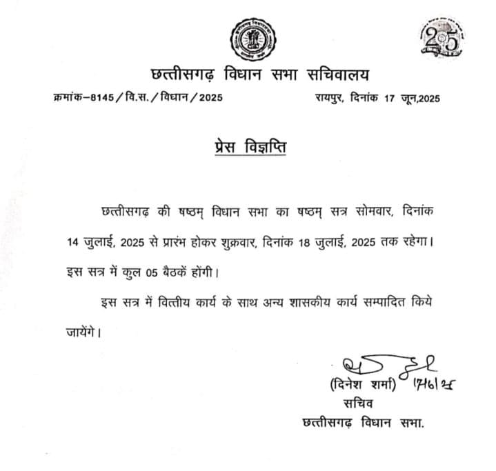 रायपुर – छत्तीसगढ़ विधानसभा का मानसून सत्र 14 जुलाई से होगा। इसे लेकर अधिसूचना जारी कर दी गई है। छत्तीसगढ़ विधानसभा का षष्टम् सत्र 14 जुलाई 2025 सोमवार से प्रारंभ होकर 18 जुलाई 2025 (शुक्रवार) तक रहेगा।