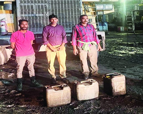 कोरबा : एसईसीएल गेवरा परियोजना में सीआईएसएफ की क्यूआरटी टीम ने वाटर टैंकर से डीजल चोरी करते तीन कर्मियों को पकड़ा। यह घटना पिछली रात की बताई गई है। इनमें फीटर सतीश कुमार जायसवाल, जनरल मजदूर रामकृष्णा और गिरजाशंकर शामिल हैं। मौके से तीन जेरीकेन में से दो में 45 लीटर डीजल मिला। एक जेरीकेन खाली पाया गया। मामले को दीपका पुलिस को सौंप दिया गया है। एएसआई जितेश सिंह ने बताया कि सीआईएसएफ की ओर से डीजल चोरी के बारे में लिखित शिकायत मिली है। जांच के साथ हम इस मामले में अगली कार्रवाई करेंगे।