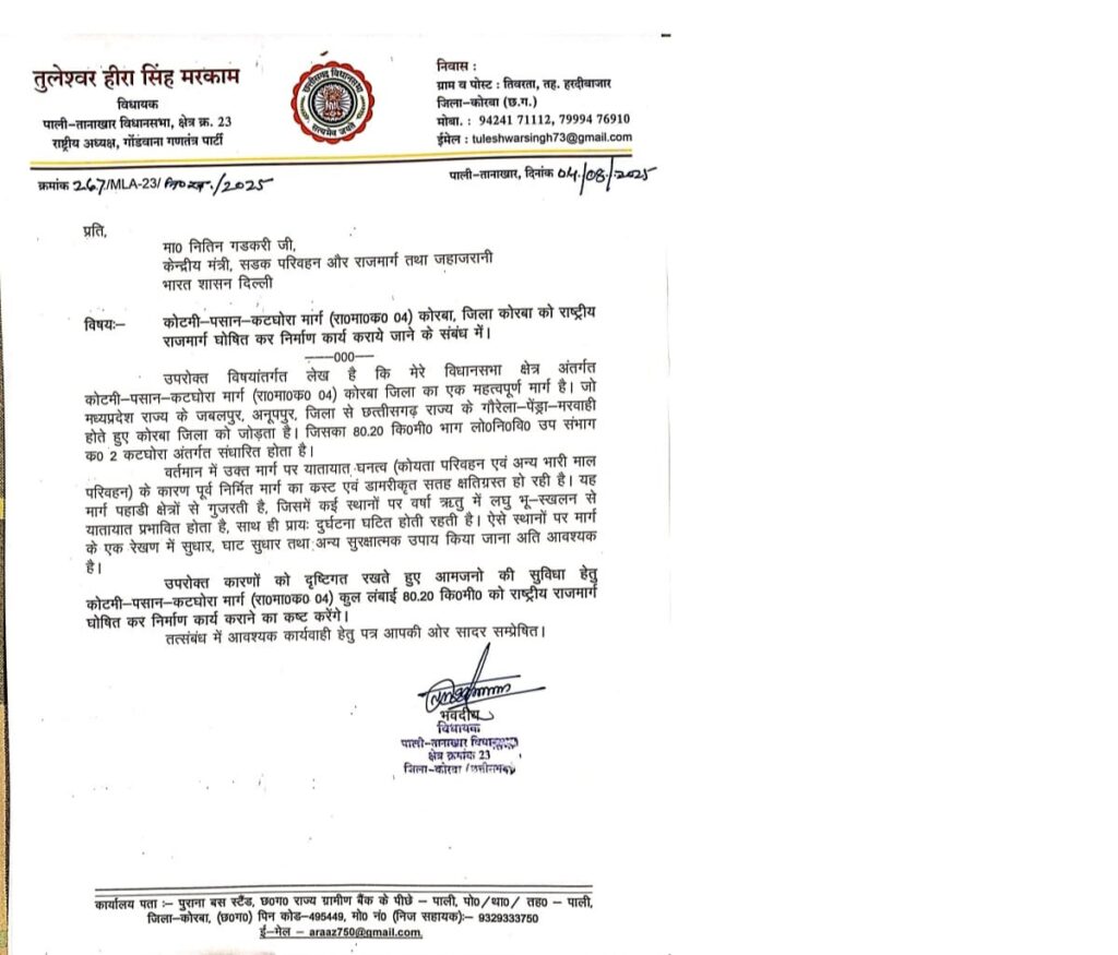 उक्त सम्बन्ध में श्री गडकरी को सौंपे ज्ञापन में विधायक ने बताया कि- विधानसभा क्षेत्र अंतर्गत कोटमी-पसान-कटघोरा मार्ग (राजकीय मार्ग क्र. 04) कोरबा जिला का एक महत्वपूर्ण मार्ग है जो मध्यप्रदेश राज्य के जबलपुर, अनूपपुर, जिला से छत्तीसगढ़ राज्य के गौरेला- पेंड्रा-मरवाही होते हुए कोरबा जिला को जोड़ता है। जिसका 80.20 किलोमीटर भाग लोक निर्माण विभाग उप संभाग क्रमांक 2 कटघोरा अंतर्गत संधारित होता है।
