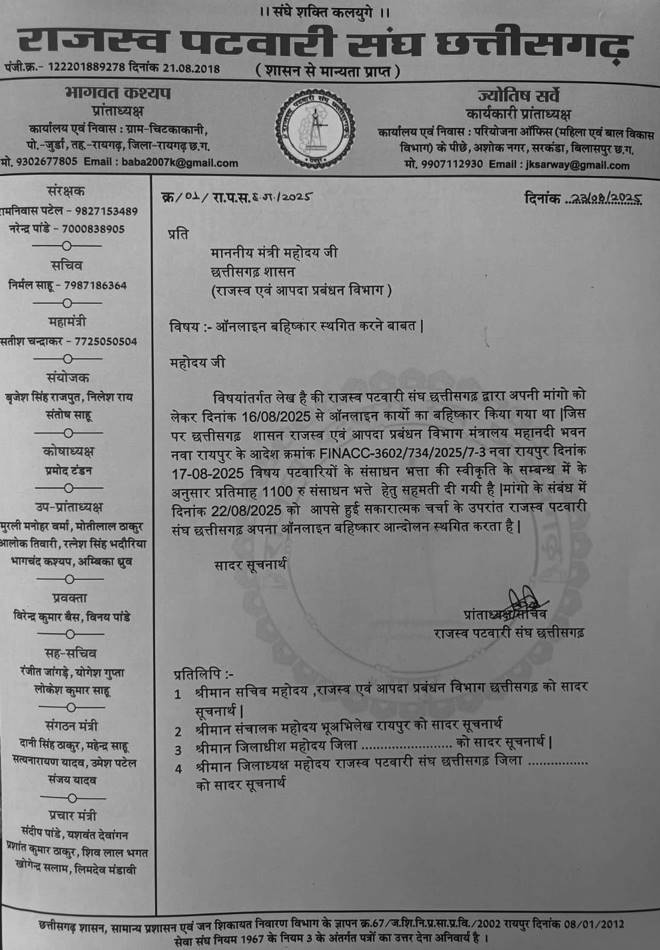 रायपुर : अपनी मांगों को लेकर विगत 16 अगस्त से ऑनलाइन कार्यों का बहिष्कार करने वाले पटवारियों ने राजस्व मंत्री से हुई सकारात्मक चर्चा के बाद अपना आंदोलन स्थगित कर दिया है.