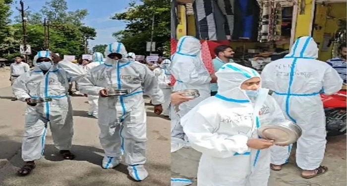 PPE किट पहनकर कर्मचारियों ने शासन-प्रशासन को कोरोना काल में किए अपने काम की याद दिलाई. साथ ही हाथ में कटोरा लेकर भीख मांगी. कर्मचारियों का कहना है कि अगर सरकार बजट नहीं होने की बात करती है तो हम भीख मांग कर फंड इकट्ठा कर रहे हैं. इस फंड को सरकार को मनी ऑर्डर किया जाएगा.