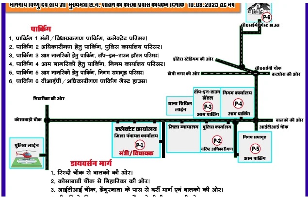 साथ ही, कार्यक्रम में शामिल होने वाले लोगों और आम जनता के लिए वाहनों की पार्किंग के निर्धारित स्थान चिन्हित किए गए हैं।