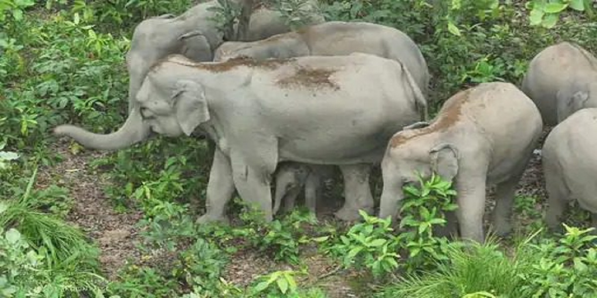 हाथी का नवजात अपनी मां के नीचे में ही खड़ा रहा। इस तस्वीर को निगरानी में जुटे बीट फॉरेस्ट ऑिफसर अशोक कुमार श्रीवास ने अपने ड्रोन कैमरे में कैद किया।