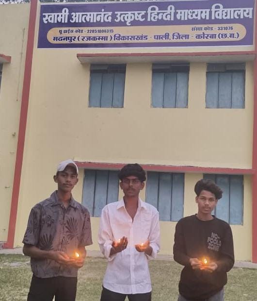 रजकम्मा(पाली19 अक्टूबर 2025(KRB24NEWS))-विद्यालय को देवालय की संज्ञा प्रदान करते हुए माननीय शिक्षा मंत्री के आह्वान पर स्वामी आत्मानन्द उत्कृष्ट विद्यालय मदनपुर के छात्रों ने एक दीया मुख्यमंत्री के नाम से प्रज्वलित किया।