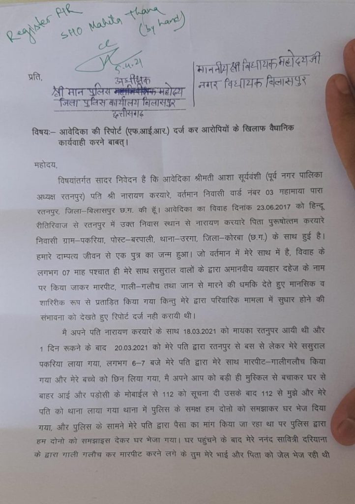 नगर विधायक शैलेश पाण्डेय के वेयर हाउस रोड़ स्थित सरकारी बंगले में रतनपुर की पूर्व नगर पालिका अध्यक्ष आशा सूर्यवंशी ससुराल वालों के जुल्मों सितम से छुटकारा दिलाने न्याय की गुहार लेकर पहुंची। महिला ने विधायक को अपनी आप बीती सुनाई और आरोप लगाया कि दहेज के नाम पर किस तरह पति नारायण करवारे निवासी ग्राम पकरिया पोस्ट बरपाली उरगा कोरबा के साथ मिलकर उसके ससुर पुरुषोत्तम करवारे,सास गीता देवी और देवर सुखदेव करवारे द्वारा मारपीट कर यातनाए दी जाती है। मारपीट के साथ ससुराल वालों ने उसके पिता और भाई के साथ भी अभद्र व्यवहार किया गया। इन सब के बीच वह लोक लाज के डर से सब कुछ सहती रही। मगर जब ससुराल वालों की मारपीट नही सह पाई तो उरगा पुलिस से मदद मांगी लेकिन वहां भी पुलिस ने मेरी कोई मदद न कर उल्टा सुलह कर लो बोलकर वापस लौटा दिया।
