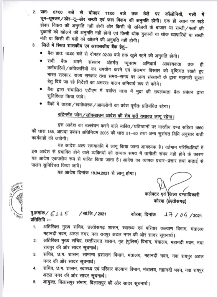 लाॅकडाउन अवधि के दौरान जिले के शासकीय और अशासकीय बैंक प्रातः 11 बजे से दोपहर दो बजे तक खुले रहेंगे। सभी बैंक संस्थान अपने न्यूनतम आवश्यकतानुसार कर्मचारियों-अधिकारियों का उपयोग करते हुए केवल कार्यालयीन कार्य ही संचालित करेंगे। बैंको में ग्राहक, खातेदार या आम लोगों का प्रवेश पूर्णतः प्रतिबंधित रहेगा। बैंक द्वारा संचालित एटीएम में पर्याप्त मात्रा में मुद्रा की उपलब्धता बैंक प्रबंधन द्वारा सुनिश्चित की जाएगी।