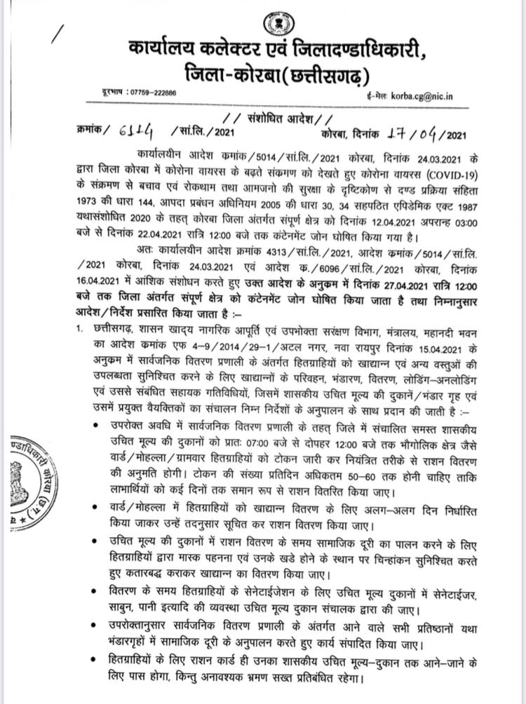 कोरबा 17 अप्रैल ( KRB24NEWS ) : कोरोना संक्रमण के बढ़ते प्रकरणों को देखते हुए कोविड-17 वायरस से बचाव और उसकी रोकथाम के लिए 12 अप्रैल से 22 अप्रैल तक लागू की गई पूर्ण तालाबंदी कोरबा जिले में पांच दिन बढ़ा दी गई है। कोरबा जिले में कोरोना संक्रमण से आमजनों की सुरक्षा को देखते हुए पूर्ण तालाबंदी अब 27 अप्रैल की रात 12 बजे तक रहेगी। जिला दण्डाधिकारी श्रीमती किरण कौशल ने इस संबंध में संशोधित आदेश भी जारी कर दिया है।