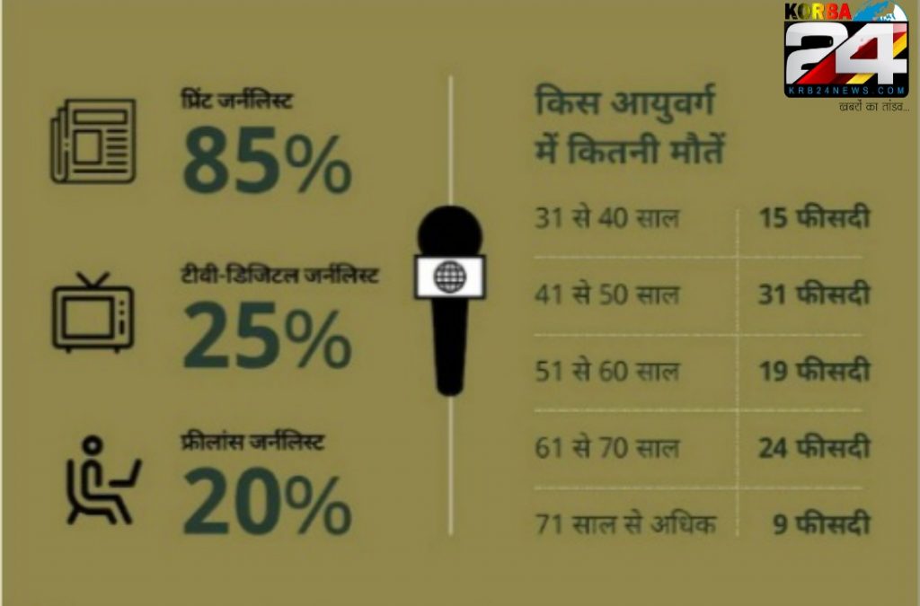 कोरोना संक्रमण से मरने वाले पत्रकारों में करीब 55 फीसदी प्रिंट मीडिया से, 25 फीसदी टीवी और डिजिटल मीडिया से तथा 19 फीसदी फ्रीलांस पत्रकारिता से जुड़े थे.